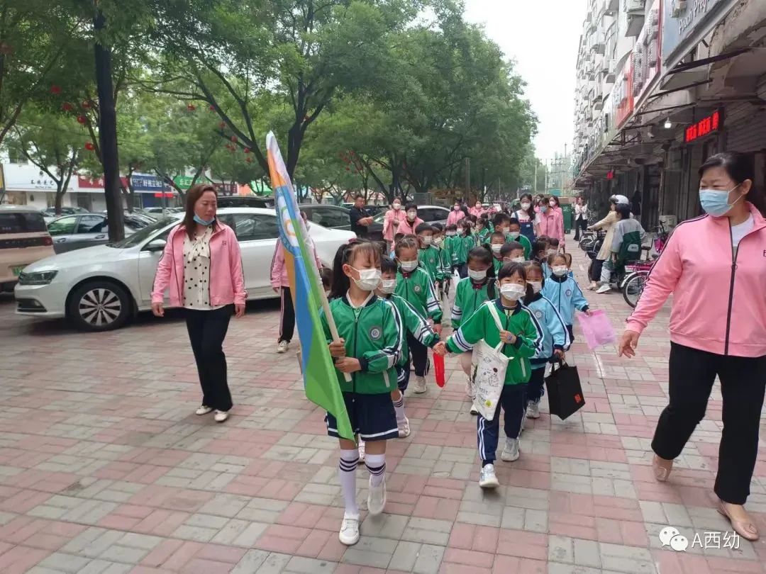 带着园长妈妈的嘱托,孩子们提着环保购物袋,以大带小的形式向超市走去。一路上园旗随风飘扬,老师们细心陪伴在两侧。