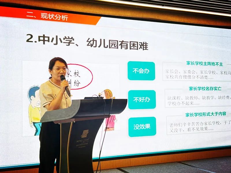 家长学校教学是家长学校办学的核心重点,也是目前家长学校工作开展面临的最大难点,已经平稳运行近五年的“义方家长”教学服务平台,目前已为全省6559中小学幼儿园创建了网上家长学校,围绕《家长成长课堂》提供线上教学、效果评估和教学管理,解决了家长进校难、家长管理难、师资不足、课程缺乏等实际困难,把家长学校办成了一所真正的学校,并实现了家长学校课程系统化、教学常态化、办学规范化、管理数据化。基于《家庭教育信息化共享服务平台》的家长学校数字化建设,河北省家长学校网络部主任刘涛做了专题报告,分别对平台的意义、平台的主要功能,以及平台的应用做了具体介绍。