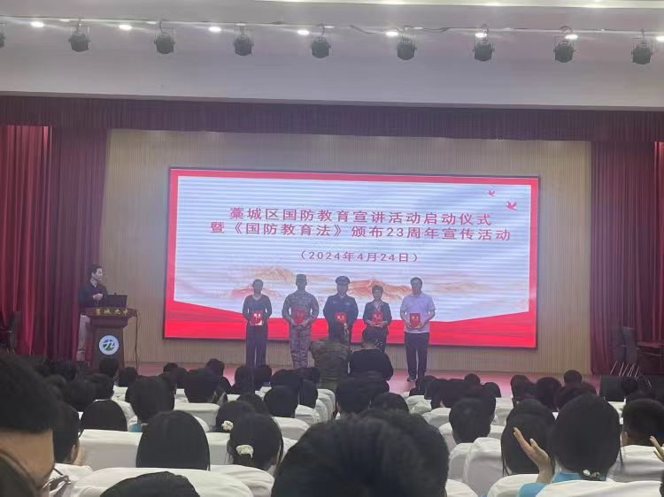 国无防不立,民无兵不安。为落实立德树人根本任务,加强学生思想政治建设,弘扬爱国主义精神,培养国防意识,厚植家国情怀,4月24日,藁城区第九中学开展了以“国防教育进校园,同心共筑家国梦”为主题的国家安全教育会议。藁城区人武部部长赵德军、区委宣传部张英杰主任和九中德育副校长吴松敏等学校领导及高二年级学生参加了会议,会议由政教处主任王红亮主持。