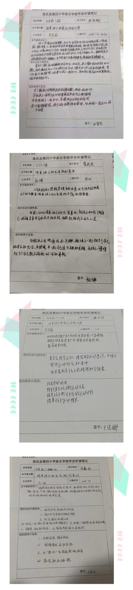 初中生涯规划是提高自身素质,寻找理想职业,进行人生设计的一个起点。高邑县家长学校第四课以《培养孩子的生涯规划意识》《帮助孩子掌握复习方法》《培养孩子热爱运动的习惯》为主题,将个人习惯养成、责任担当和生涯理想有机结合起来,让家长在学习中提升自己,做助力型家长,为孩子的成长赋能。家长们认真收看,并撰写笔记。